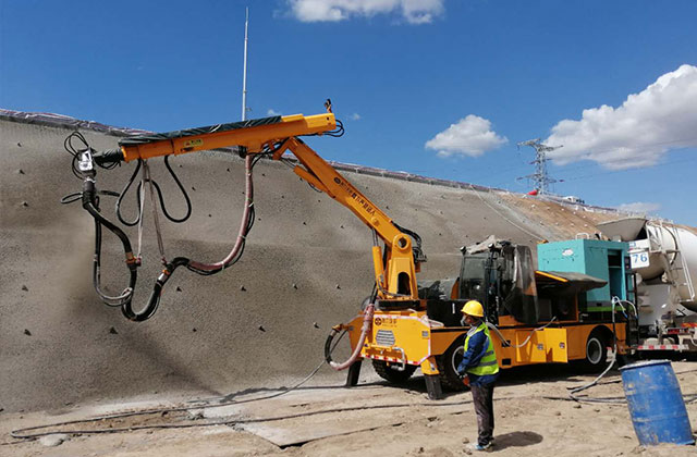 混凝土濕噴機械手是智能化高適應性濕噴混凝土設備,通過無線遙控器操作噴射臂的噴射位置和噴嘴的角度,減少了操作人員與混凝土的接觸,同時降低了粉塵濃度,改善了作業環境,保障了施工人員的身體健康。混凝土濕噴機械手廣泛應用于鐵路隧道、公路隧道、水利涵洞、礦山巷道、堤壩邊坡、建筑基坑和軍事工程等領域施工中的噴射混凝土支護作業。